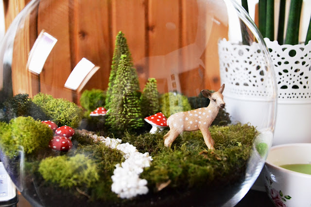 テラリウムの中にキノコと鹿のフィギュアを入れれば、ザ・メルヘンな世界のできあがり。かわいらしい雰囲気が好きな人にばれること間違いなしです!
